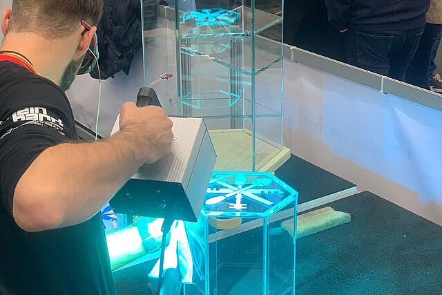 Die Herausforderung: ein mehrstöckiges Möbelstück, das auch Bleiglas-Elemente enthielt, innerhalb einer vorgegebenen Stundenzahl von Donnerstag bis Samstag anzufertigen und präzise zusammenzusetzen. Das Kunstobjekt bestand aus drei Teilen: der untere Teil war eine Vitrine, der mittlere Teil bestand aus Bögen mit Bleiverglasung, und zuoberst - als Zusatzaufgabe - eine hexagonförmige Säule mit Deckel, auf dem das Innungszeichen der Glaserinnen und Glaser sandgestrahlt wurde. Dabei waren höchste Genauigkeit und handwerkliches Können gefragt: exaktes Ausmessen, manuelles Zuschneiden der Gläser, präzise Bohrungen, UV-Verklebungen der Einzelteile sowie das Sandstrahlen des Innungszeichens.